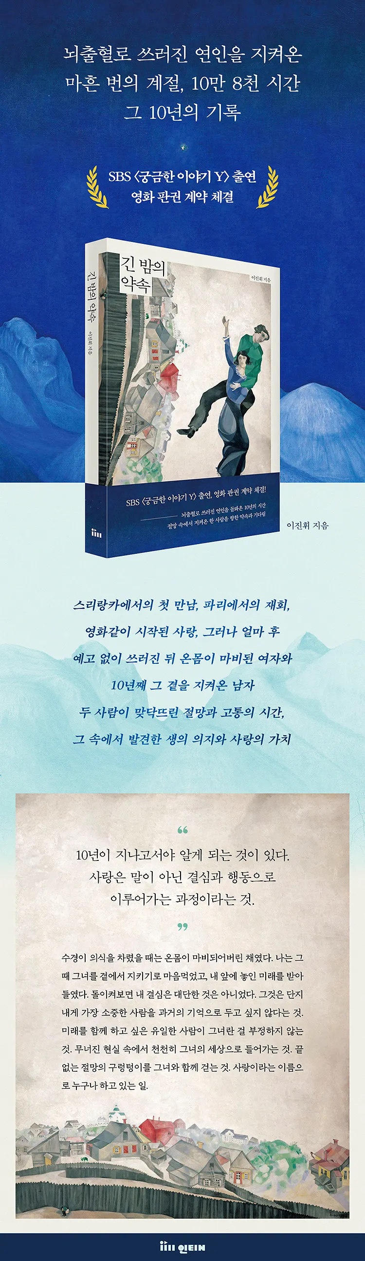 2014년 뇌출혈로 쓰러진 후 온몸이 마비된 연인 허수경 씨를 10년 가까이 돌봐온 이진휘 씨의 에세이이다. 저자와 수경 씨의 사연은 2018년 SBS [궁금한 이야기 Y]를 통해 알려지며 많은 사람의 감동과 안타까움을 불러일으켰다. 방송 이후의 두 사람의 소식을 궁금해하는 사람이 많았지만 어디에도 소개된 적 없었다. 『긴 밤의 약속』은 방송 이후 저자가 처음으로 두 사람의 이야기를 직접 써내려간 책이다. 책에는 해외에서 처음 만나 사랑에 빠진 두 사람의 영화 같은 시작과, 수경 씨가 쓰러진 이후 달라진 두 사람의 일상, 10년을 이어온 간병 생활 속에서 한 개인이 느꼈던 절망과 불안, 그 긴 시간 속에서 저자가 발견한 사랑의 가치에 대한 이야기가 진솔하게 담겨 있다.