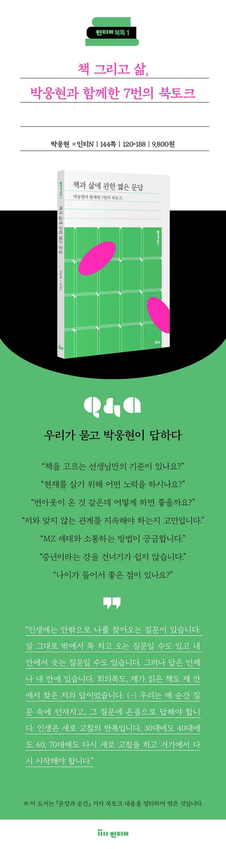 박웅현 소장의 이야기는 때로 『문장과 순간』 『여덟 단어』와 같은 자신의 저서들과 닿아 있기도 했고 지난 경험이 녹아 있기도 했다. 그것은 저자의 이야기이면서도 독자들을 향한 하나의 제안이자 조언, 위로였으며 격려와 응원이었다. 이 모든 북토크를 주관하거나 함께한 인티N은 ‘북토크’ 현장의 이야기를 정리해 엮어보아도 좋겠다는 생각에 ‘인티N 북톡’ 시리즈를 기획했고 박웅현과 독자들이 나눈 이야기를 이 시리즈의 첫 번째 책 『책과 삶에 관한 짧은 문답』으로 엮어냈다.