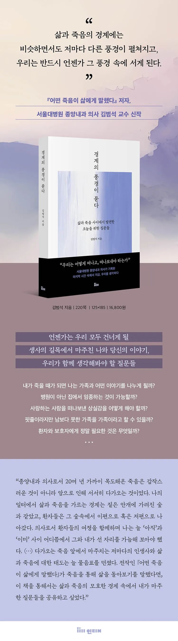 서울대학교 암병원 종양내과 의사이자 『어떤 죽음이 삶에게 말했다』 저자 김범석 교수의 에세이. 저자는 자신이 지켜봐온 죽음은 암으로 인해 서서히 다가오는 것이어서 삶과 죽음의 경계가 늘 모호하다고 이야기한다. 그 과정 속에서 의사인 저자는 환자와 보호자들, 그들이 가진 사연을 지켜볼 수밖에 없고, 죽음에 대한 공포와 불안, 다가오는 죽음 앞에서 터져 나오는 복잡한 사정들을 보고 들어야 했다. 저자는 이번에도 그들의 이야기를 흘려보내지 않고 그 속에서 오늘을 사는 우리에게 유효한 질문들을 건져올렸다. 사랑하는 가족을 어떻게 떠나보내야 할 것인가, 나는 떠날 때 사랑하는 이들에게 어떤 이야기를 할 수 있을까, 영원한 상실을 어떻게 감당해야 할 것인가와 같은 질문에서부터 돌봄과 간병, 입원으로 발생하는 문제들, 외주화되는 죽음에 이르기까지, 저자가 이 책에 담아낸 이야기는 인간이라면 꼭 한 번 생각해봐야 하는 질문들이다. 저자는 전작 『어떤 죽음이 삶에게 말했다』에 이어 남겨두지 않으면 그 모든 것이 흘러가버린다는 것을 알기에 기록으로 남겼다. 1부에서는 우리가 사랑하는 사람을 어떻게 떠나보내야 하고 떠나야 할지를 이야기해보았고, 2부에서는 병과 죽음에 수반되는 현실적인 이슈에 관한 생각을 담았다.