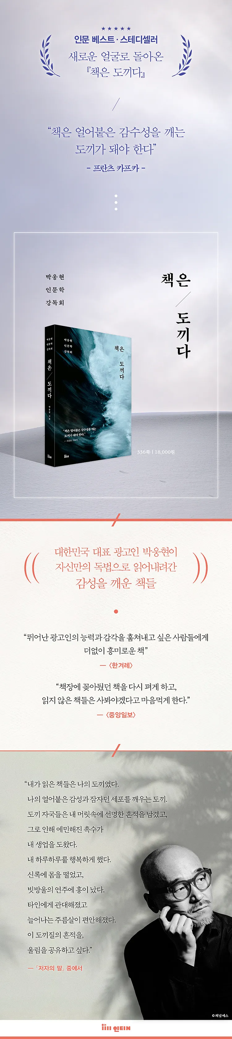 새로운 모습으로 만나는 『책은 도끼다』. 대한민국 대표 광고인 박웅현이 자신만의 독법으로 읽어낸 시대의 ‘도끼들’. 이 책은 출간 후 45만 부 가까이 판매된 베스트셀러이자 스테디셀러인 『책은 도끼다』의 개정판이다. 인문학을 바탕으로 광고를 만들며 주목받은 광고인 박웅현이 자신에게 ‘울림’을 주었던 책들을 이야기한다.