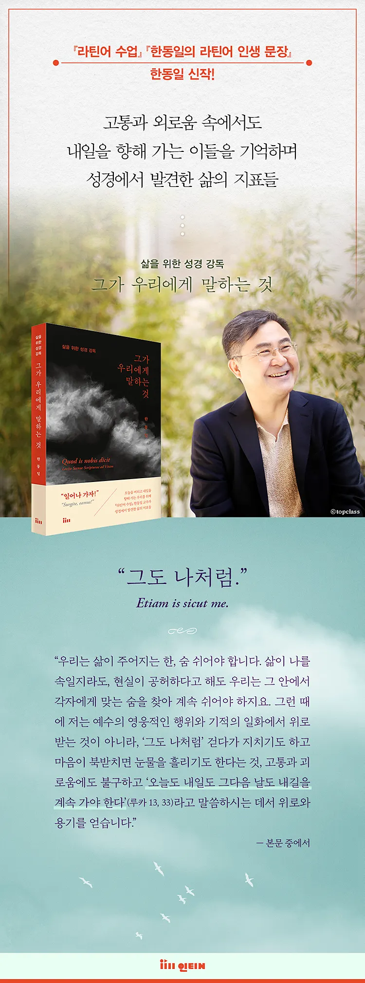 『라틴어 수업』으로 100쇄를 돌파한 한동일 작가의 신작이 출간되었다. 바티칸 교황청 대법원 ‘로타 로마나’ 700년 역사상 한국 최초 동아시아 최초의 변호사로도 알려진 한동일 작가는 저자 스스로 ‘공부하는 노동자’라고 소개하지만, 그는 오랜 시간 가톨릭교회의 사제이기도 했다. 그러나 지난 2021년 사제직을 내려놓았고 이 사실을 자신의 책 『믿는 인간에 대하여』를 통해 알렸다. 이번 신작 『그가 우리에게 말하는 것』은 저자가 일반인이자 평범한 신앙인으로 돌아와 다시 들여다본 성경 속에서 마주한 그 자신과 우리에 대한 이야기이다. 그는 이 책이 “사제라는 이름으로 보낸 21년 동안할 수 없었던 강론을 글로 옮긴 것 같기도 하고, 친근한 것에서 즐거움을 찾고자 하는 몸부림”이었다고 말한다. 그의 마음에 닿은 성경 구절과 성경 이야기, 그 구절에서 만난 자신의 지난 날과 오늘, 나아가 종교 공동체가 함께 생각해보면 좋을 화두를 담았다. 또한 성경을 잘 이해하고 아는 저자는 단순히 성경 구절을 통해 생각한 바를 옮기는 데 그치지 않고, 해당 구절에 담긴 지식도 함께 전하고 있다.